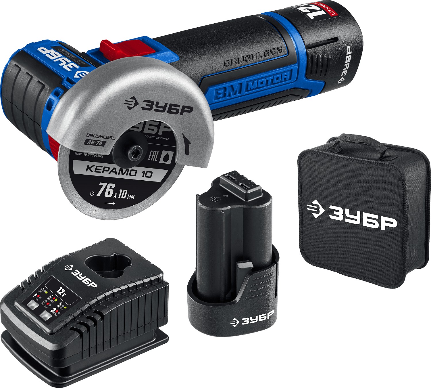 ЗУБР 12 В, d76 мм, 2 АКБ тип Т7 (2 А·ч), бесщеточная УШМ, сумка, Профессионал (AB-76-22)