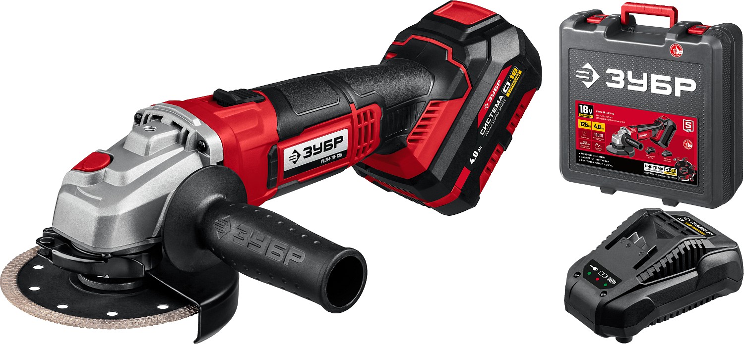 ЗУБР С1-18, 18 В, 125 мм, 1 АКБ (4 А·ч), УШМ, кейс (УШМ-18-125-41)