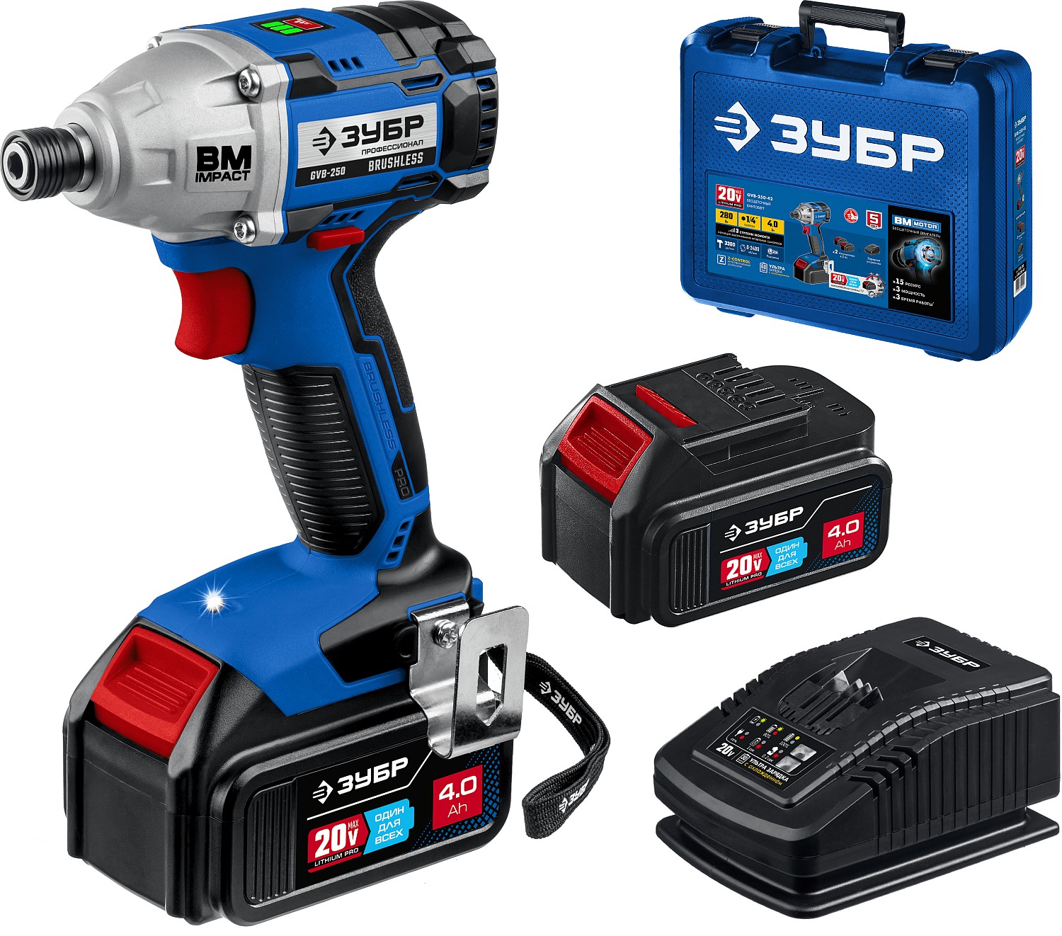 ЗУБР Т7, 20 В, 280 Н·м, 2 АКБ (4 А·ч), бесщеточный винтоверт, кейс, Профессионал (GVB-250-42)