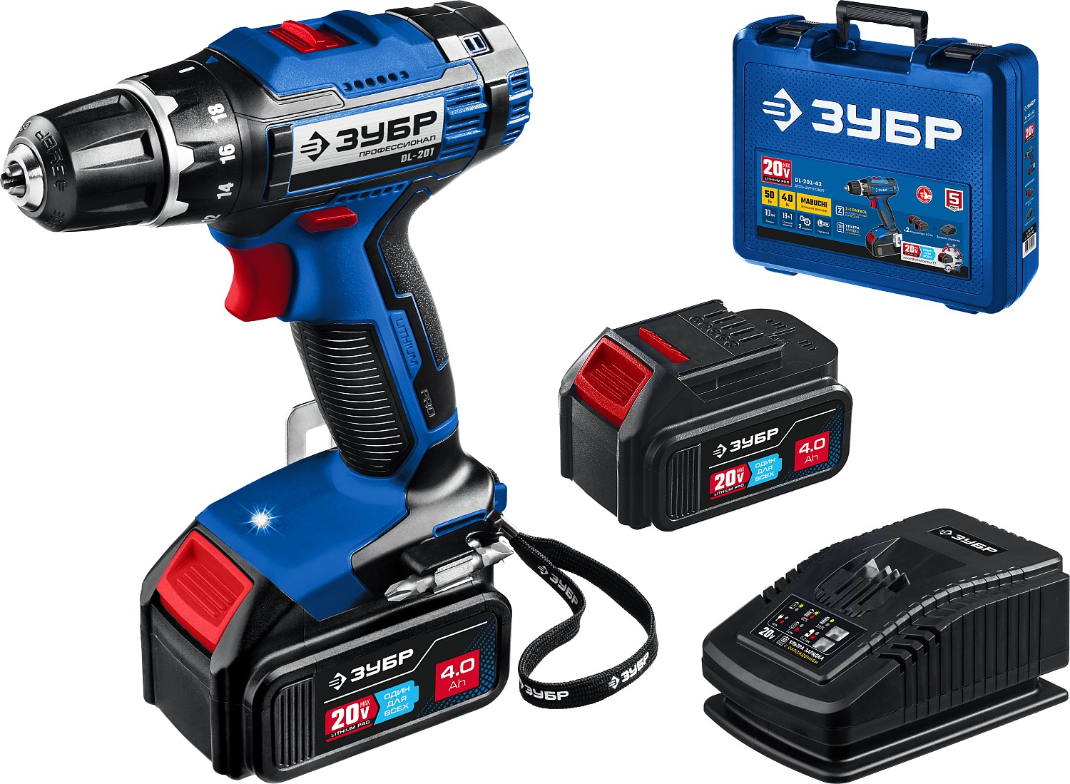 ЗУБР Т7, 20 В, 50 Н·м, 2 АКБ (4 А·ч), дрель-шуруповерт, кейс, Профессионал (DL-201-42)