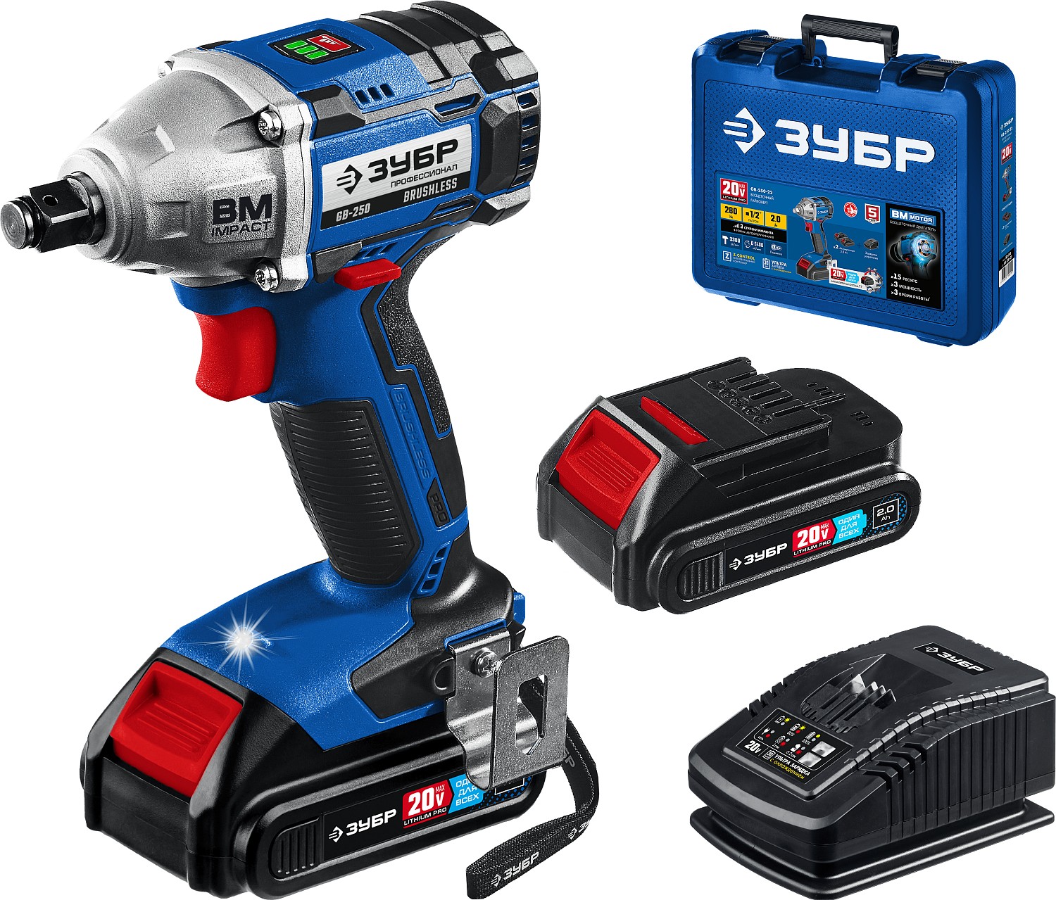 ЗУБР Т7, 20 В, 280 Н·м, 2 АКБ (2 А·ч), бесщеточный гайковерт, кейс, Профессионал (GB-250-22)