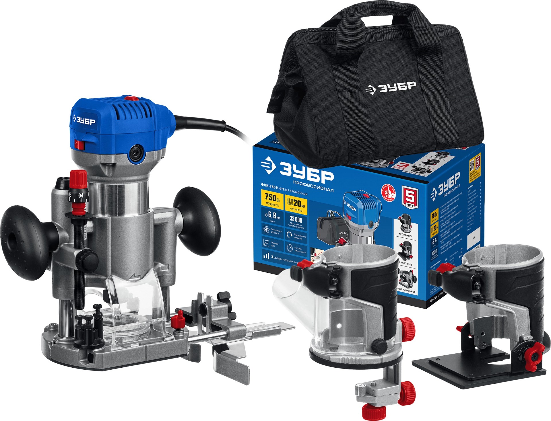 ЗУБР 750 Вт, кромочный фрезер, сумка, 3 основания, Профессионал (ФПК-750Н)