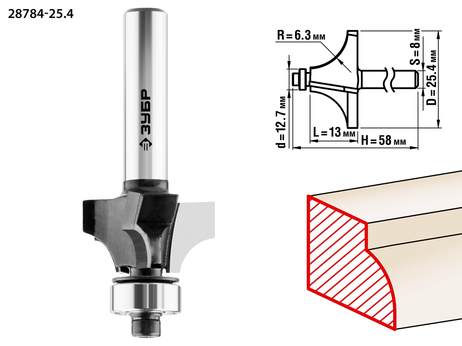 ЗУБР 25.4 x 13 мм, радиус 6.3 мм, фреза кромочная калевочная №1, Профессионал (28784-25.4)