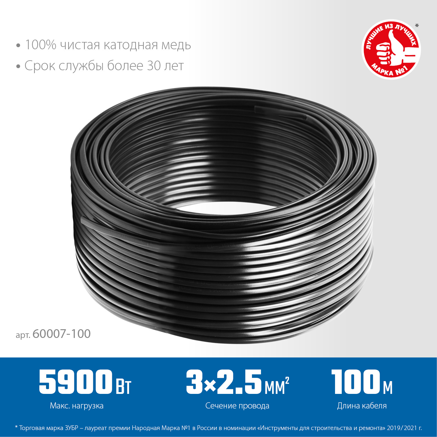ЗУБР ВВГ-Пнг(А)-LS, 3 x 2.5 мм2, 100 м, ГОСТ 31996-2012, плоский, силовой кабель с пониженным дымо-газовыделением, Профессионал (60007-100)