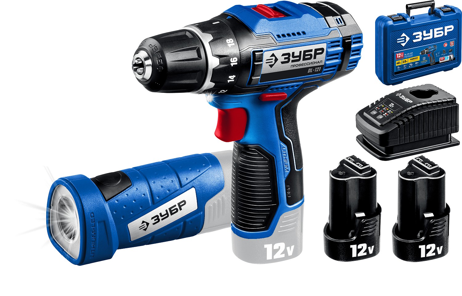 ЗУБР 12 В, 40 Н·м, 2 АКБ тип Т7 (2 А·ч), дрель-шуруповерт + LED фонарь, кейс, Профессионал (DL-121-22F)